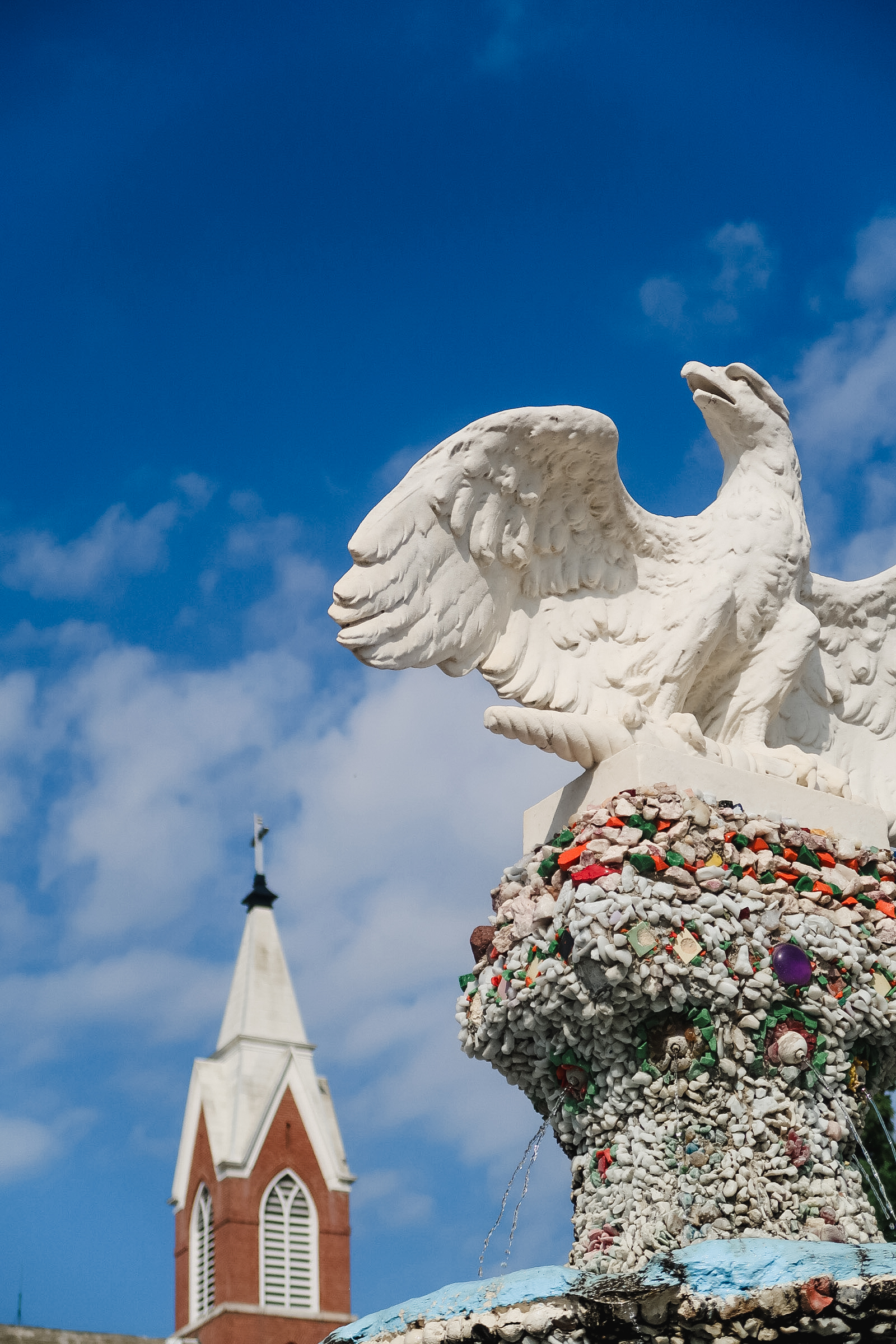 This shrine’s steward isn’t the Virgin Mary or Jesus Christ. Instead, it’s watched over by Christopher Columbus, who’s flanked on either side by statues of Abraham Lincoln and George Washington. And of course, there’s a statue of an eagle, wings outstretched and beak agape, perched atop the fountain at the shrine’s center.